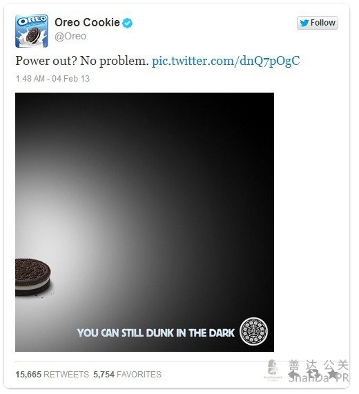 這則應景的消息贏得了大量的分享和好評,在沒有占用奧利奧任何預算投入的條件下,成功上演“屌絲的逆襲”,占據了社會化媒體版塊里的用戶“頭條”,成為Twitter的營銷教科書里又一起典型案例