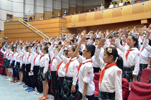 在主題教育活動現(xiàn)場,團(tuán)市委書記王忠寶作了重要講話,他希望全體學(xué)員通過這一年的學(xué)習(xí)培訓(xùn),能充分運用在隊長學(xué)校所學(xué)知識,以新的思維、新的眼光和新的姿態(tài)當(dāng)好“火車頭”、勇做“智多星”,回到學(xué)校帶領(lǐng)少先隊員小伙伴一起開展少先隊活動,共同快樂成長。值此建隊63周年之際,《信仰的種子》浙江優(yōu)秀校園聯(lián)絡(luò)點暨浙江少兒頻道校園記者站溫州站授牌活動也隨之啟動。活動中,舉行了隆重的授牌儀式,溫州市共有11所學(xué)校成為浙江少兒頻道校園記者站。記者站的成立將全面展示我市及11個縣(市、區(qū))少先隊活動及少年兒童成長的風(fēng)采。