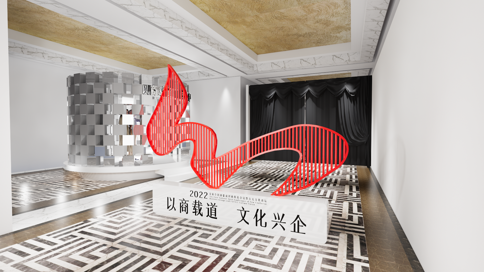 舞臺屏幕采用卷軸樣式,中西合璧,LED屏幕配合視頻制造裸眼3D效果,兩邊舞美設計可延伸為機械臂和航空航天,使古代與現代相融合,文化與科技相碰撞,打造出沉浸式場景互動,整個設計可以與視頻相配合,宣傳方太航天廚房與硬核科技。